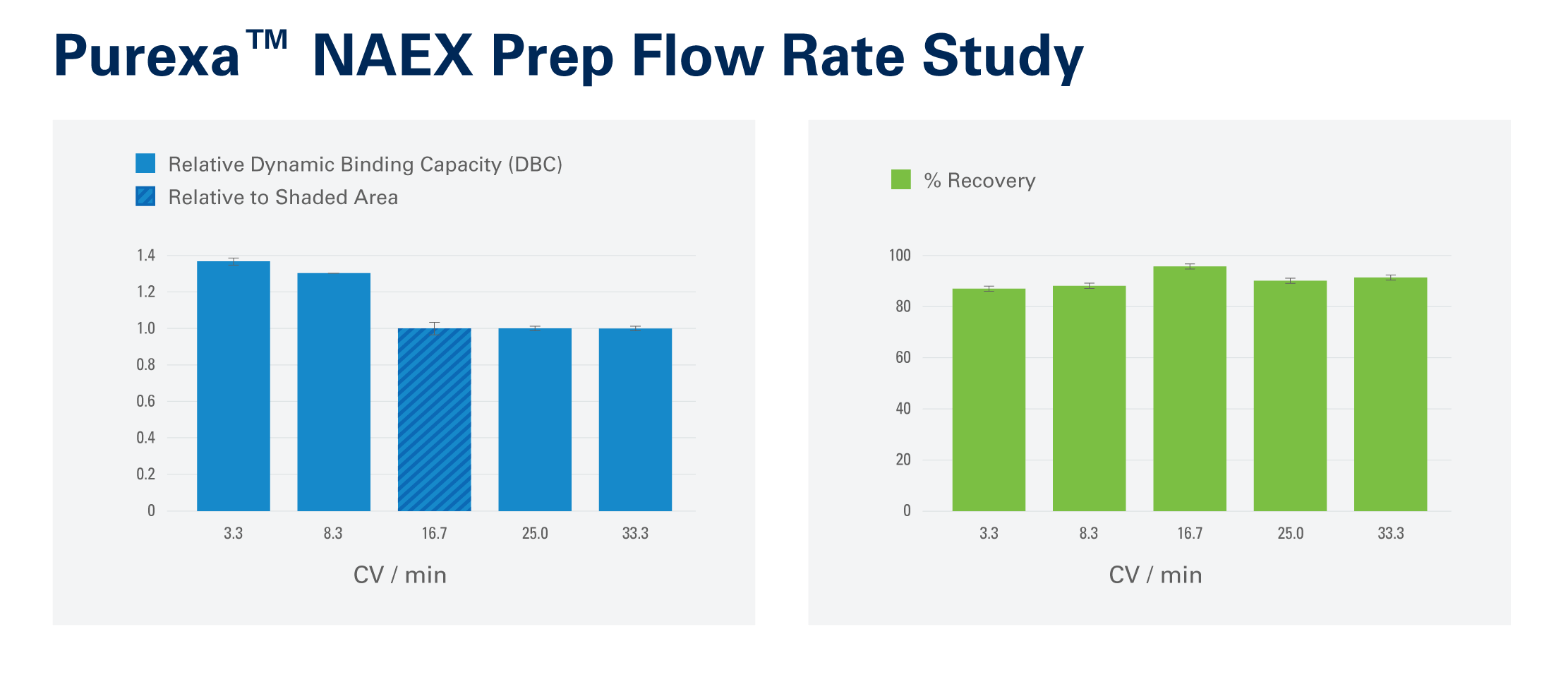 The proprietary structure of tertiary amine ligands on the NAEX membrane binds plasmid DNA at selected buffer conditions and uses high conductivity conditions to release the DNA. Purexa™ NAEX offers consistency across flow rates and multiple cycles while offering:
