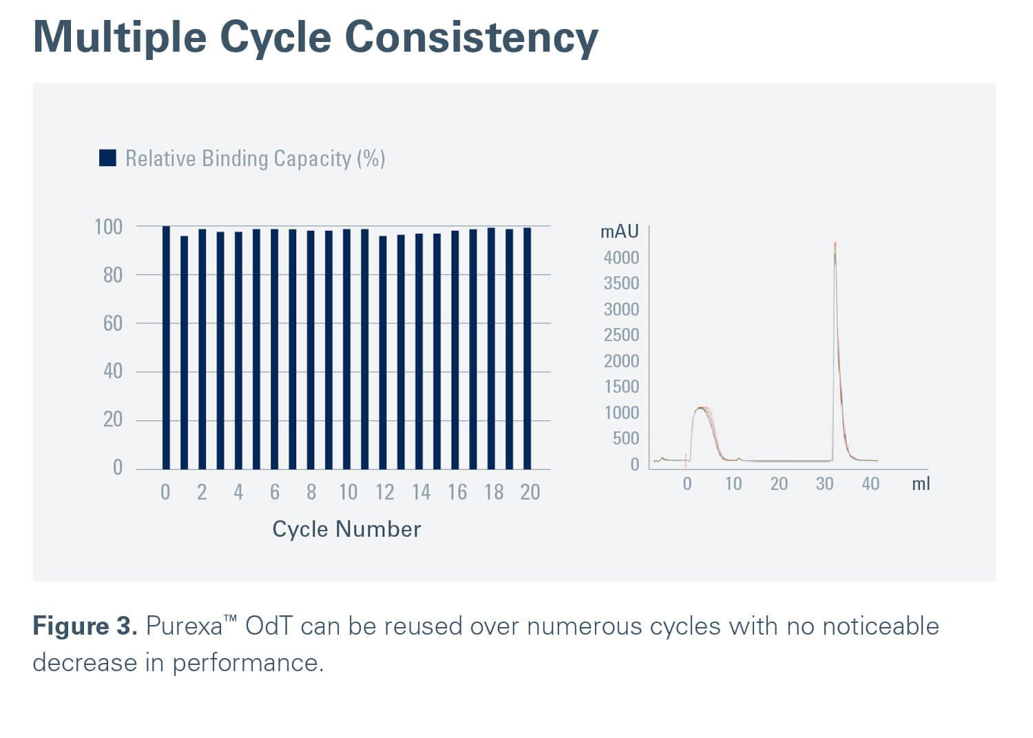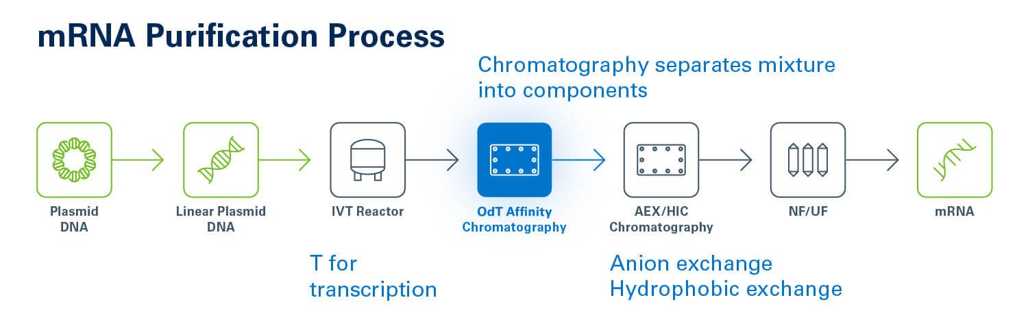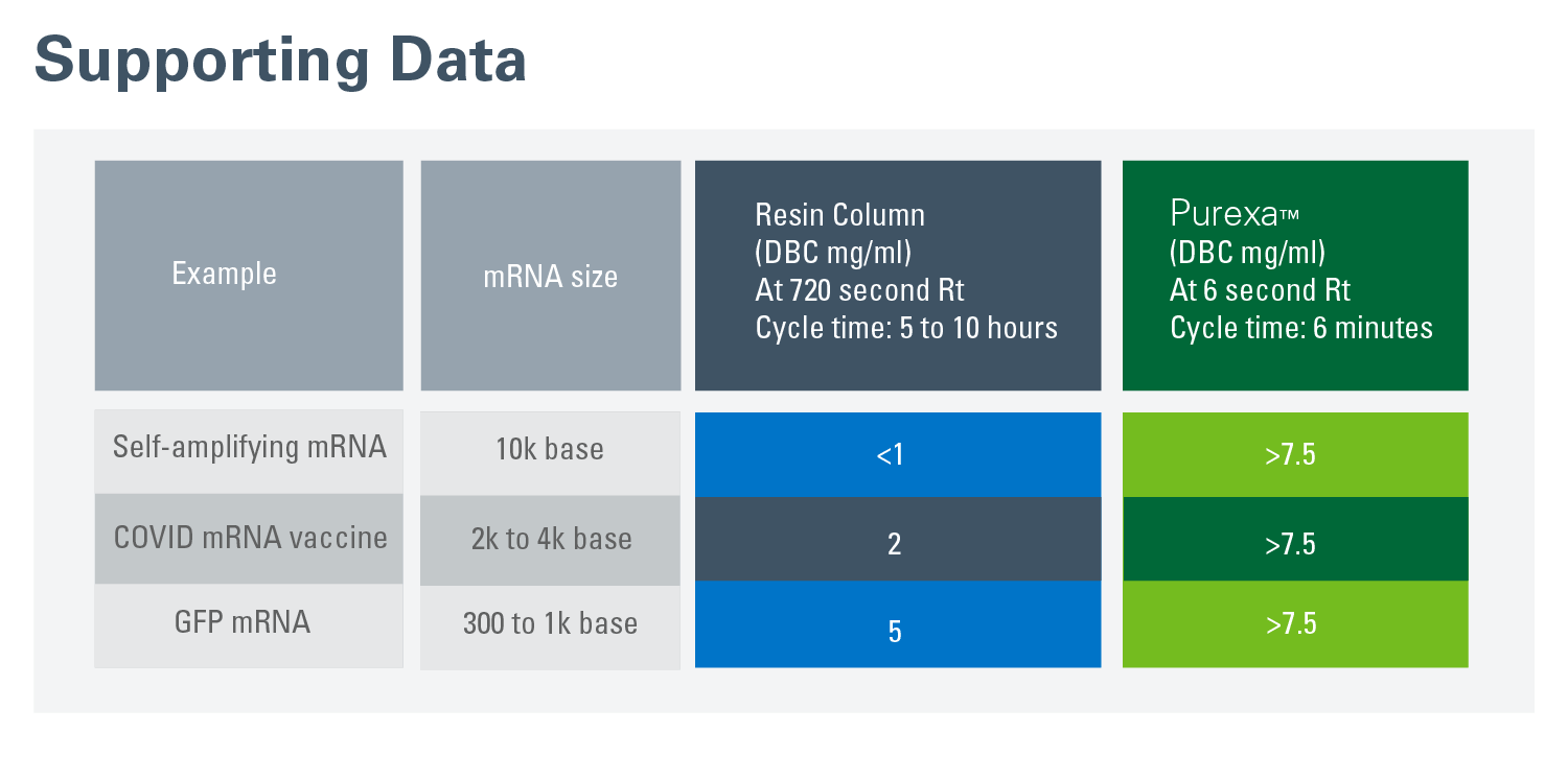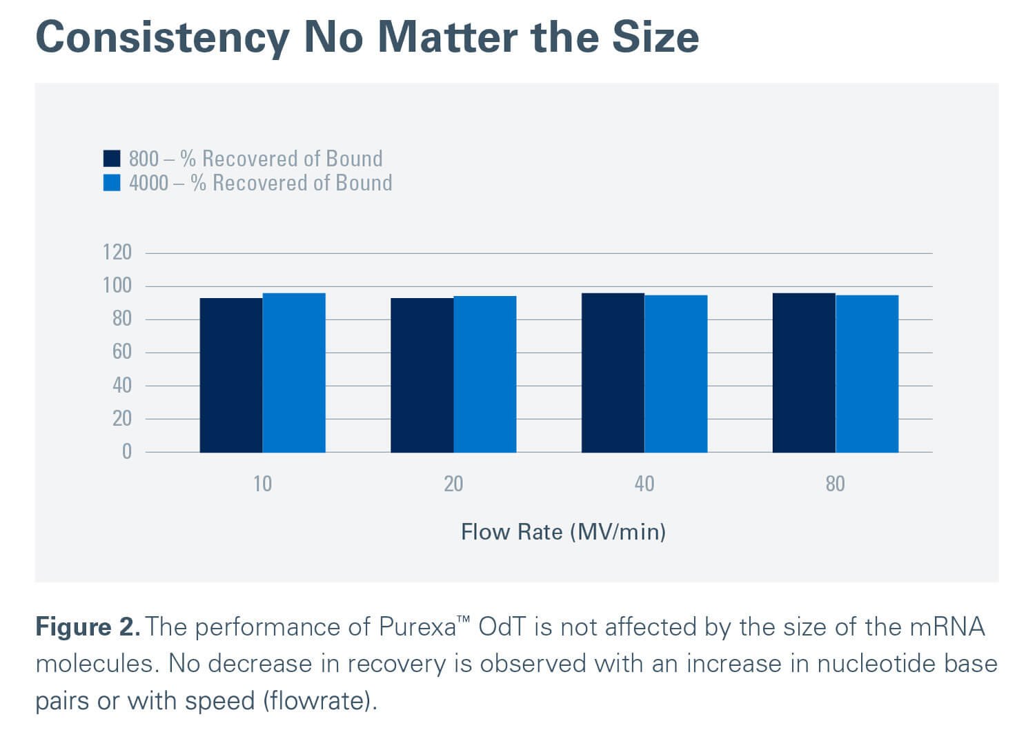 Purexa™ OdT は、標的 mRNA の分子サイズに関係なく、高効率に分離することが可能です。高速フロー条件下でも高純度のエリュートを提供し、生産性を向上させます。Purexa™ OdT を当社の HIC および AEX カラムと組み合わせることで、mRNA の高効率分離を実現するシームレスな精製プロセスを構築できます。